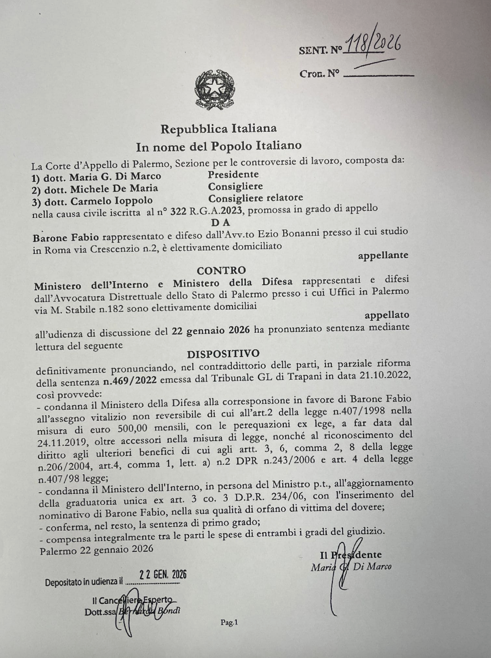 È stato così riconosciuto l’assegno vitalizio di 500 euro con decorrenza dal novembre 2019, oltre agli ulteriori benefici e all’aggiornamento della graduatoria nazionale da parte del Ministero dell’Interno.